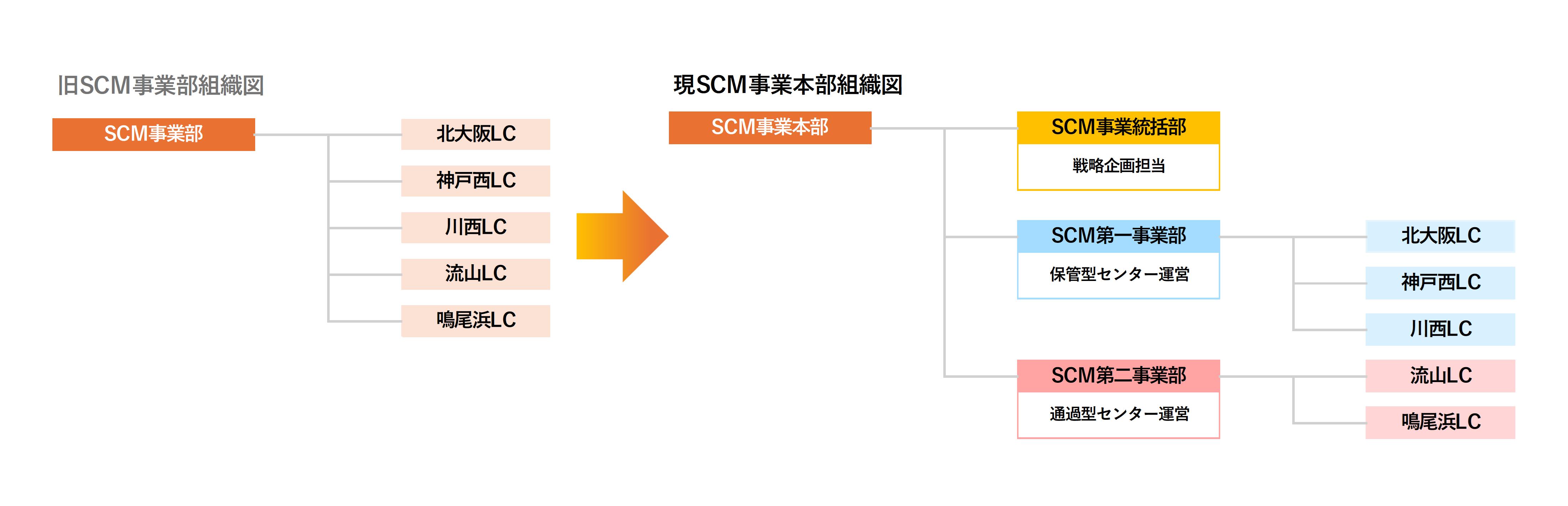 これまでのSCM事業部では、各ロジスティクスセンター(以下、LC)を直接配下に置き、全体を大括りで管理・運営してきました。しかし組織再編後は、SCM事業本部のもとに「事業統括部(戦略企画)」「第一事業部(保管型センター運営)」「第二事業部(通過型センター運営)」を設け、業務内容ごとに分けて運営しています。